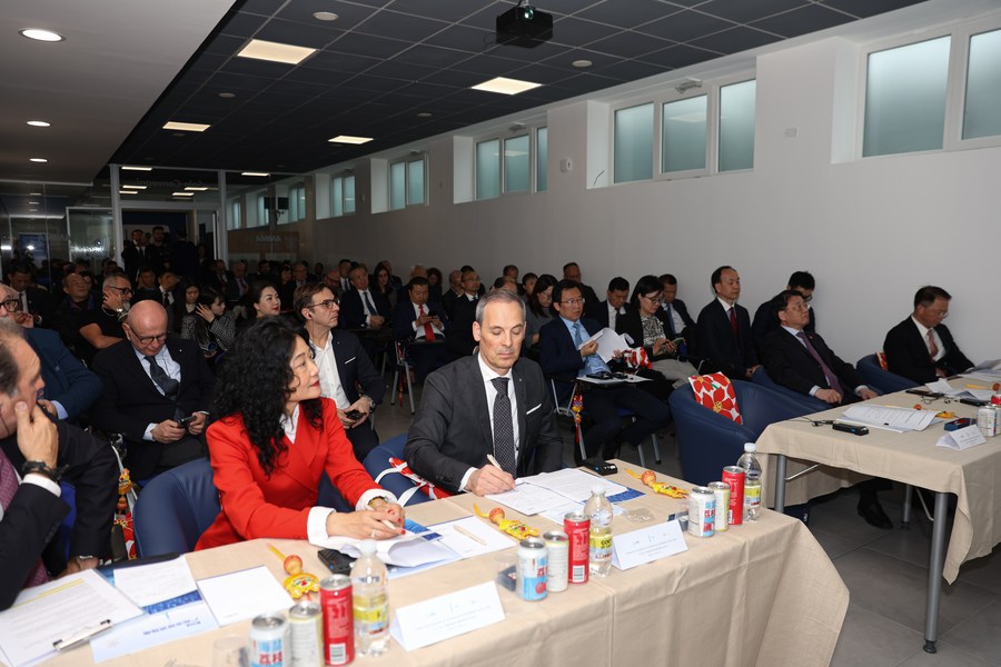 People attend the debut press conference of WALOVI, a Chinese herbal tea brand, in Milan, Italy, on Feb. 26, 2024.