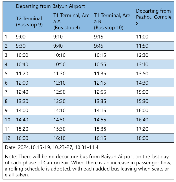 During the exhibition period (October 15-19, 2024, October 23-27, 2024, October 31-November 4, 2024), Baiyun Airport's express (空港快線) will operate a special bus line between the airport and the Pazhou exhibition hall, with each bus departing every 40 minutes on average. The first bus to the Canton Fair exhibition hall departs at 09:00 and the last at 16:00. The first bus to Baiyun Airport departs at 11:00 and the last at 18:00.
