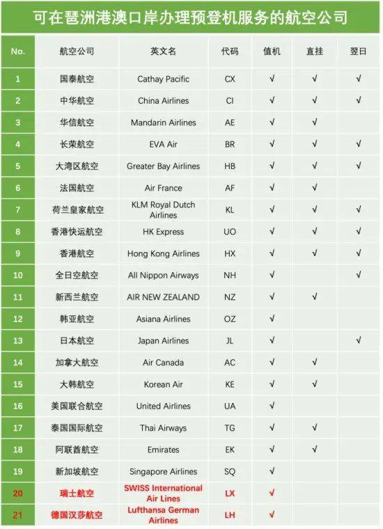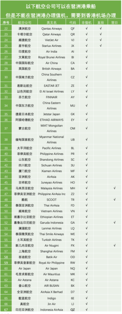 1. Passengers flying with airlines listed in columns 22-25 are eligible for direct baggage check-in service at Pazhou Ferry Terminal only if they are on direct flights. For passengers requiring transfers, they must proceed to SkyPier Terminal to check their baggage to the final destination.