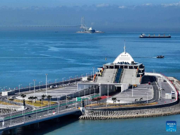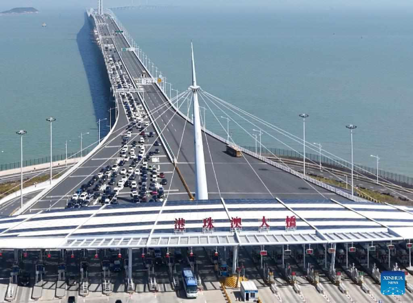 An aerial drone photo taken on February 12, 2024 shows vehicles on the Hong Kong-Zhuhai-Macao Bridge in South China. (Xinhua)