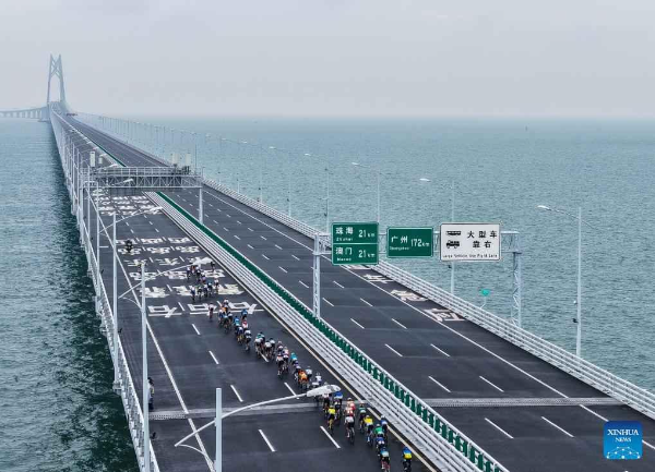 An aerial drone photo taken on November 24, 2024 shows athletes participating in a cycling race passing through the Hong Kong-Zhuhai-Macao Bridge in South China.