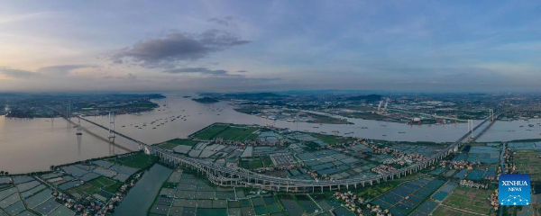This photo taken on December 7, 2024 shows a view of Gaolan Port Bridge (with twin main towers on the left) and Huangmao Sea Channel Bridge (with three main towers on the right) in South China's Guangdong province.