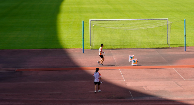 Guangzhou residents exercise at the stadium.(Photo: Nanfang Daily / Dong Tianjian)