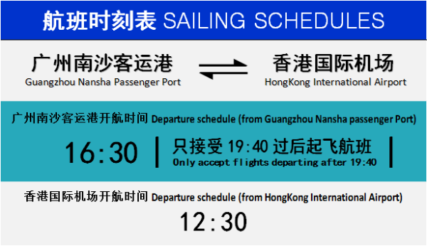 The resumed route from Nansha Passenger Port to Hong Kong International Airport will depart at 16:30 (only accept flights departing after 19:40).