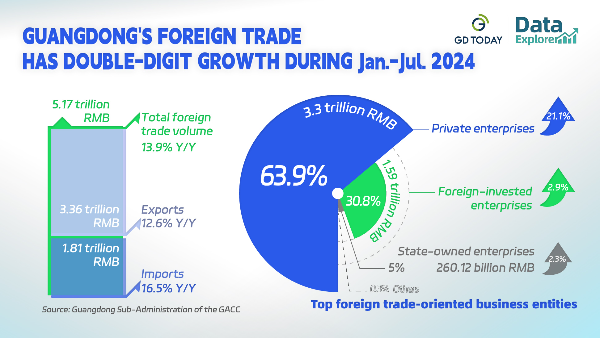 In July alone, Guangdong's imports and exports amounted to 800.03 billion RMB, reflecting a 15.5% increase, and the province has experienced four consecutive months of double-digit growth. Exports for the month totaled 519.57 billion RMB, up by 16.5%, while imports reached 280.46 billion RMB, growing by 13.8%.