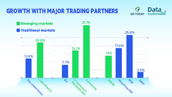 Guangdong has shown resilience in its traditional markets while also strengthening ties with emerging markets. For instance, trade with Hong Kong SAR, the United States, the European Union (EU), Japan, and the Republic of Korea (ROK) all realized positive growth rates of 17.6%, 11.4%, 7.7%, 3.5%, and 25.4%, respectively. Emerging markets such as ASEAN, Latin America, 17 countries in the Middle East, and 5 countries in Central Asia recorded impressive growth rates of 13%, 20.8%, 16.1%, and 31.1%.