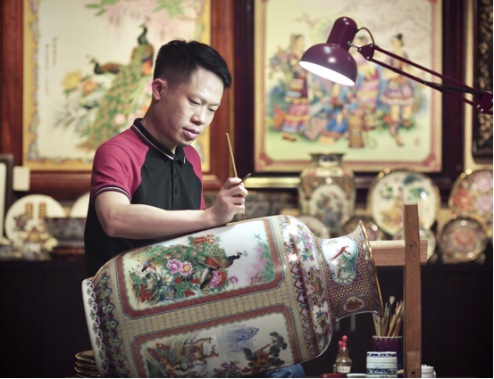 Zhou Chengjie is the municipal-level inheritor of Canton porcelain making techniques, a national intangible cultural heritage item. He studies and learns lost techniques from the exported Canton porcelains of the Thirteen Factories in the Qing Dynasty, and integrates them into modern works.