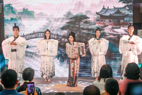 People dressed in Hanfu, a traditional garment of the Han ethnic group, perform at the opening ceremony of the 2024 Orchid Cultural and Tourism Week on April 13, 2024.