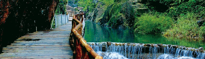 People who visit such a wonderland, can have a good swim in the green spring, water fights in its shallows, and play water walking ball and nucleus ball. They may also stand on the arch bridge or zigzag bridge or lounging on the river bank to appreciate the magnificent waterfall. On glancing to the heavens, snow-white clouds macrh across a blue sky,while gentle breeze is drifted from the mountains to rotate the windmill. Lakes, islands, green water and sandbanks are all integrated into this graceful presence that is Baisghuizhai.