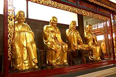 The Hall of Five Hundred Arhats faces south with its south-north axle from the hall gate to the statue of the Buddha at the north end. On its East and West sides are corridors, enshrining and worshiping the 500 Arhats on the 1-meter-plus-high pedestals. The original statues were destroyed completely during the "Cultural Revolution". The existing statues were re-sculpted in 1997 according to the drawing of Five Hundred Arhats drawn in Emperor Guangxu's reign in Qing Dynasty and relevant data. The statues of the Arhats are lifelike, in different postures and moods, to which numerous tourists are drawn and it indulgesthem in great pleasures.