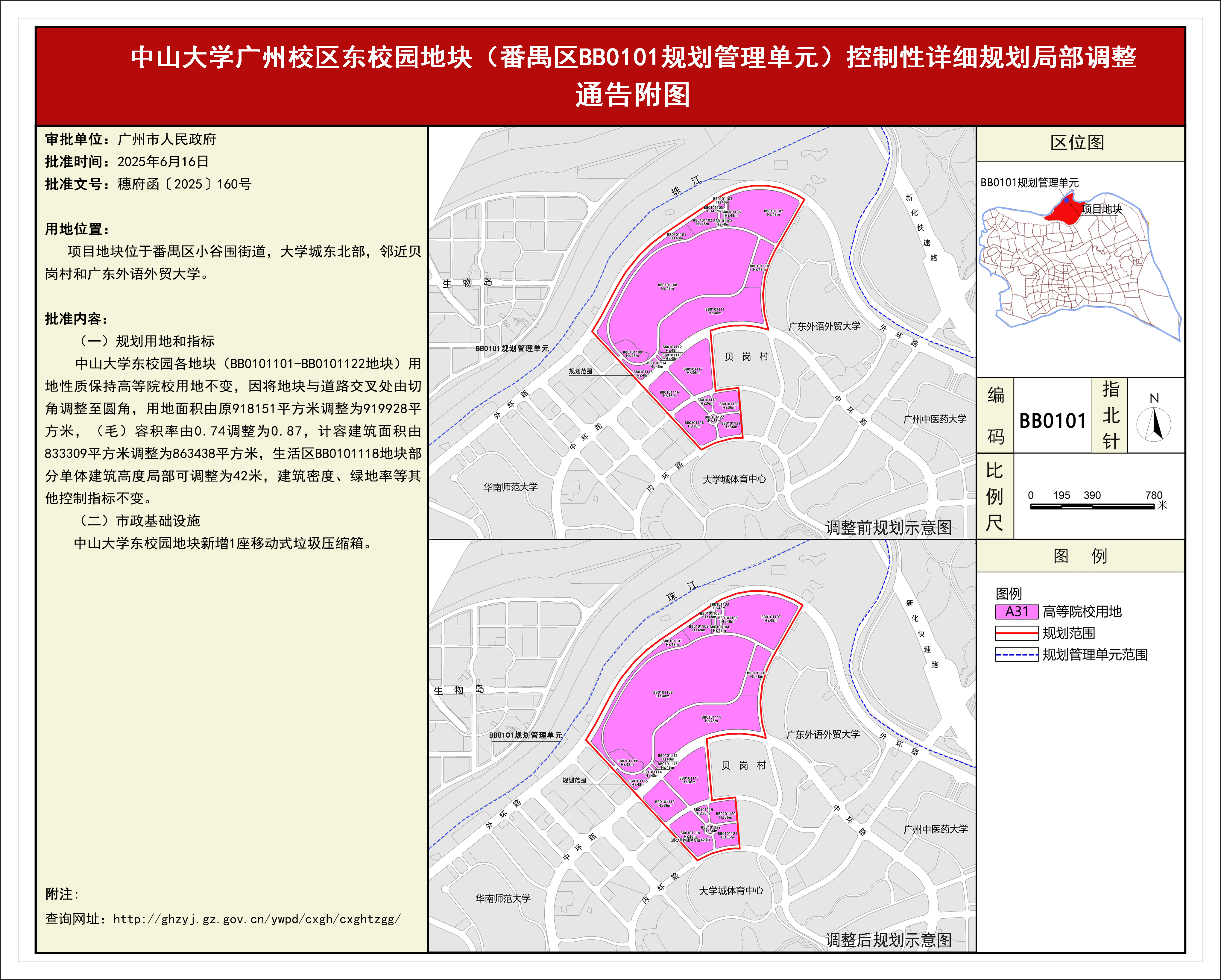 根據《廣東省城市控制性詳細規劃管理條例》,《番禺區六涌河以北地塊(BD0501規劃管理單元)控制性詳細規劃局部調整》《中山大學廣州校區東校園地塊(番禺區BB0101規劃管理單元)控制性詳細規劃局部調整》2項規劃成果已完成編制、審查、公示等程序,由廣州市規劃委員會審議通過后經廣州市人民政府批準(穗府函〔2025〕160號),自批準之日(2025年6月16日)起生效。