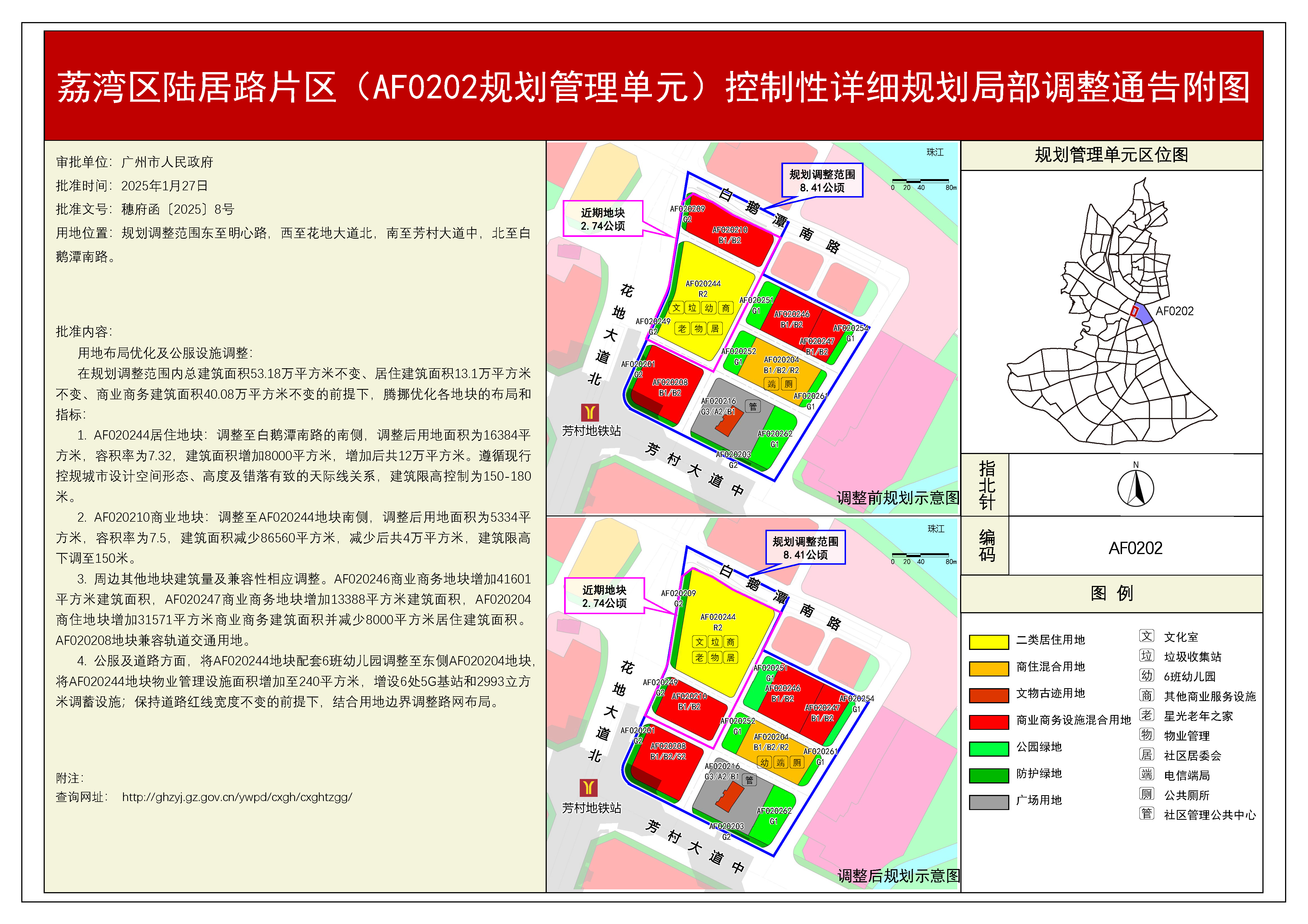 根據《廣東省城市控制性詳細規劃管理條例》,《荔灣區陸居路片區(AF0202規劃管理單元)控制性詳細規劃局部調整》規劃成果已完成編制、審查、公示等程序,由廣州市規劃委員會審議通過后經廣州市人民政府批準(穗府函〔2025〕8號),自批準之日(2025年1月27日)起生效。
