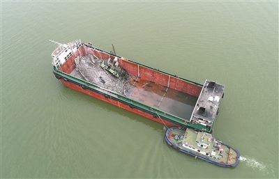 2月22日,涉事船只被拖走,船身上有掉落的車輛(無人機照片)。