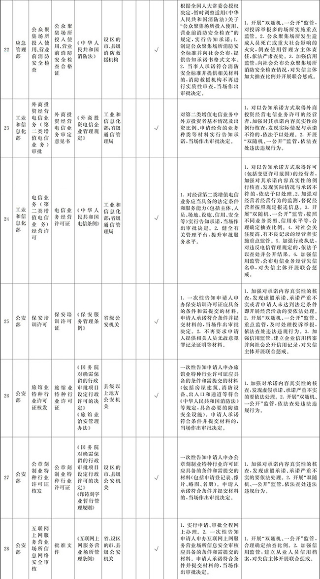 (四)創新和加強事中事后監管。要堅持放管結合、并重,按照“誰審批、誰監管,誰主管、誰監管”原則,加強審批與監管的銜接,健全監管規則和標準,堅決糾正“不批不管”、“只批不管”、“嚴批寬管”等問題。要全面推行“雙隨機、一公開”監管、跨部門聯合監管和“互聯網+監管”,對新技術、新產業、新業態、新模式實行包容審慎監管,對高風險行業和領域實行重點監管。要加強信用監管,依法查處虛假承諾、違規經營等行為并記入信用記錄,實行失信聯合懲戒。要強化社會監督,依法及時處理投訴舉報,引導社會力量參與市場秩序治理。要增強監管威懾力,對嚴重違法經營的企業及相關責任人員,依法撤銷、吊銷有關證照,實施市場禁入措施。