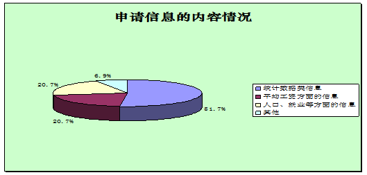 從申請(qǐng)的信息內(nèi)容看,15宗是國民經(jīng)濟(jì)各行業(yè)的統(tǒng)計(jì)數(shù)據(jù)類信息,占比51.7%;6宗是平均工資方面的信息,占比20.7%;6宗是人口、就業(yè)等方面的信息,占比20.7%;2宗是其他方面的信息,占比6.9%。