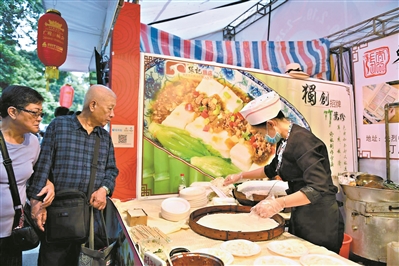 竹嵩粉、拌魚皮、雪燕香橙燉蛋……這些美食都是由廚師現場制作,絕對新鮮出爐。剛出鍋的食物香氣撲鼻而來,令人食指大動。美食的確是治愈心靈的良藥,買到心儀美食的人們,喜悅之情溢于言表,許多人端著紙碗在街邊大快朵頤,整條街道都洋溢著祥和喜慶的熱鬧氣氛。