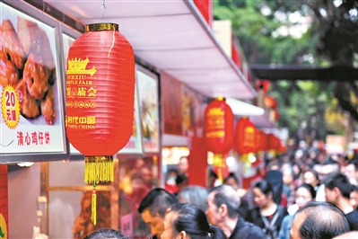 廣府廟會期間,惠福東路搭起了百米長的美食街,放眼望去都是廣州人氣極高的美食檔鋪,絕不是普通的街邊小食。記者在現場看到,西關老字號陳添記美食店的檔口前排起了長隊。陳添記魚皮以爽脆可口的口感聞名。平日里為了吃上一份陳添記魚皮,天南海北的食客們都聚到廣州西關的老店里尋味,今天在廟會上就能嘗到這等美味,自然就成為美食街的焦點之一。