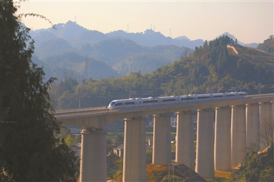12月6日,在湖南省湘西土家族苗族自治州吉首市境內,列車在張吉懷高鐵吉首段行駛。