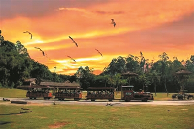 長隆野生動物世界里最近在園區(qū)景觀設計中加入高科技沉浸式投影裝置,每到傍晚時間,絢麗的燈光塑造出草原動物“大遷徙”的盛況,這種“傍晚看夕陽、夜間看動物”的游玩方式吸引了眾多本地游客前來打卡。觀賞夕陽的路線可以這樣定制,在傍晚大概五點之后,游客可以搭乘園區(qū)的免費纜車,從熊貓樂園站乘坐天鵝湖線,在半空中環(huán)繞式領略夕陽之下的天空和灑落草原的霞光,隨手拍都能拍出夕陽無限好的美景。纜車到站后還可以站在天鵝湖的鴻雁橋上領略大雁南飛、落日湖光的魅力。當夜幕降臨,家長還可以帶著孩子乘坐流光溢彩小火車游園,夜探光影交織的“東非大草原”,感受全新的沉浸式景觀,體驗不同的夜間動物世界,看看在夜里的動物習性和白天里的是否會不一樣。