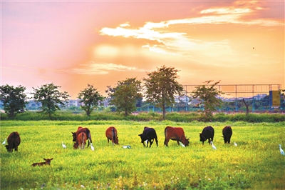 冬日里,在鄉(xiāng)村田園里還能觀賞到鷺鳥的蹤跡,在田園美景中,隨時可以欣賞“一行白鷺上青天”的美景。綠油油的草地上,黃牛、白馬、綿羊在悠閑地吃著青草,好一幅鄉(xiāng)村牧場的美麗圖畫!