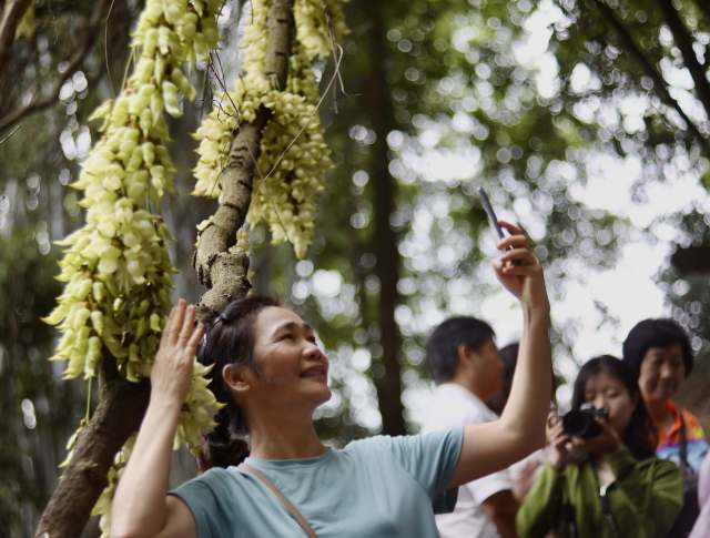 “3月20日至24日,我們在這里舉辦了禾雀花文化旅游節(jié),接待游客超過1萬,比往年增加了兩成。”黃埔區(qū)天鹿湖森林公園管理部部長周國華表示,天鹿湖森林公園主要以綠色的禾雀花品種為主,目前正是禾雀花的最佳觀賞期,花期將延續(xù)至4月初。