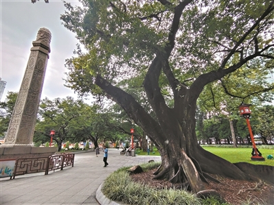 位于中山紀念堂南門至主體建筑之間的西側園道邊,有一株特殊的黃葛榕(大葉榕),其地根外露,根莖高0.5米,根長4米,有脊有鱗,宛如一條蛟龍游戲于樹下,因而此樹得名“游龍休憩”。黃葛榕(大葉榕)樹冠寬廣,早春換葉前老葉變黃紛紛飄落,樹上樹下一片金黃,頗有北方深秋的韻味;新葉開展后滿樹翠綠,春意盎然,生機勃勃,是南方少有的季相分明的樹種。