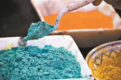 近日,記者在余蔭山房見到了崔鏡興,他正在工作室制作灰塑作品,面前擺滿了顏料、紙筋灰以及各種工具。只見崔鏡興不停地往底座上包灰,用手捋出形狀,或用灰匙輕壓,慢慢地,幾朵“花”就躍然案上,此時,再用小灰匙蘸取各種顏料,給制作完成的花朵上色?!斑@些顏料是純天然礦物質(zhì)制成的,和國畫顏料一樣,幾百元一斤,其中石綠色的最貴,一斤就要兩三千元,這一小灰匙就要兩三百元?!贝掮R興笑著說,“等顏料被完全吸收后就是成品了,這期間不能淋雨和暴曬。”
