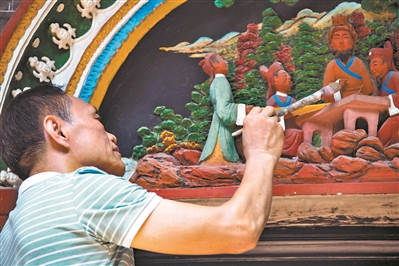 經(jīng)園方統(tǒng)計,僅文物區(qū)以內(nèi)的可辨有主題的灰塑就有約360幅。“遠近均可觀賞,色彩搭配喜用紅、黃、綠三原色,出彩奪目,在青磚墻的基調(diào)里特別明顯?!?/p>