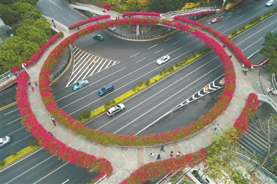 2月17日,東風路人行天橋上的簕杜鵑盛開。