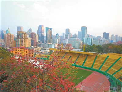 2月14日下午,航拍越秀山體育場(chǎng)與鎮(zhèn)海樓之間紅棉盛開(kāi)。