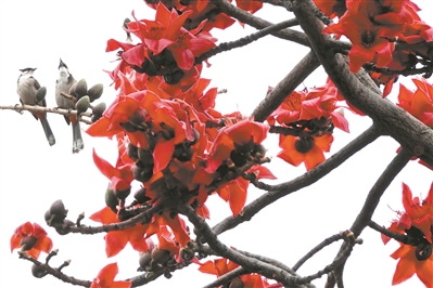 2月13日,廣州曉港公園,今年的木棉花開(kāi)得早,引來(lái)鳥兒在枝頭嘰嘰喳喳。