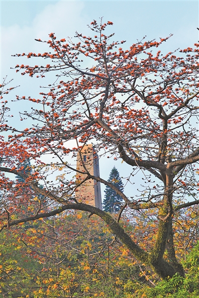 2月14日,越秀山上的中山紀(jì)念碑,木棉開(kāi)放,一片紅艷。