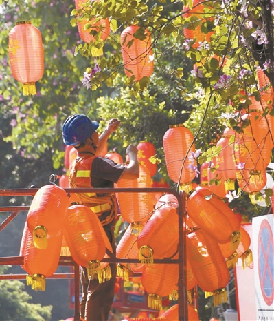 1月26日,西湖路迎春花市,工人在路邊的樹上掛上許多喜慶的紅燈籠。