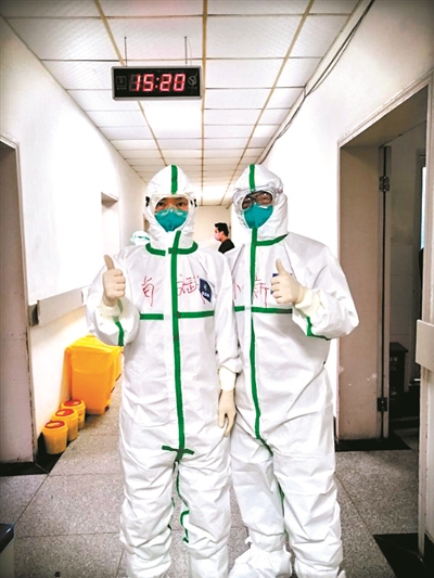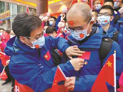 鄒旭帶領(lǐng)的廣東援助湖北第十七批醫(yī)療隊(duì)完成了援助雷神山醫(yī)院的任務(wù),撤回廣州之前,第二、第二十五批醫(yī)療隊(duì)領(lǐng)隊(duì)張忠德趕來(lái)送別。記者拍攝時(shí),他正仔細(xì)為鄒旭整理衣裝。