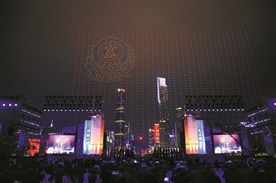 10日晚8時40分,第一組350架無人機騰空而起,在海心沙亞運公園上空變幻出“110節日快樂”圖案,代表了110報警服務臺成立35周年,為晚會拉開了帷幕。