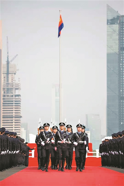 1月10日,廣州市公安局在海心沙廣場隆重舉行全市公安機關中國人民警察警旗升旗儀式,以激越的警歌、莊嚴的誓詞、高昂的斗志,向警旗敬禮,讓光榮傳續。“升旗儀式,現在開始!”上午8時30分,護旗手邁著整齊的步伐,護送警旗到達升旗臺。伴隨著振奮人心的警歌聲,升旗手將警旗揮展。紅藍相間的中國人民警察警旗冉冉升起、迎空飄揚,全警莊嚴敬禮。隨后,全體民警輔警面向警旗重溫入警誓詞,士氣激昂、聲音嘹亮。