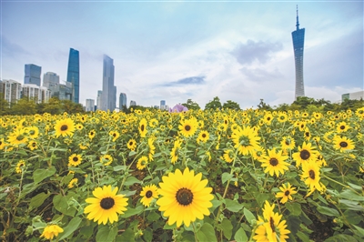 在二沙島宏城公園,大片金黃色的向日葵在陽光下璀璨奪目,像是披上了金色的夏裝,映襯著不遠處的廣州塔以及東塔西塔,十分好看。
