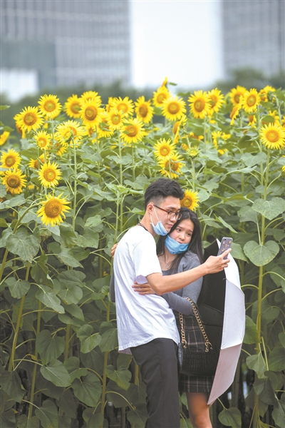 海心沙公園里,一片2米高的向日葵花海在微風中蕩漾,心形的葉子引得不少情侶駐足拍照。