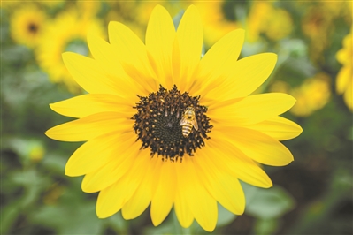 怒放的向日葵引來了眾多勤勞的小蜜蜂。
