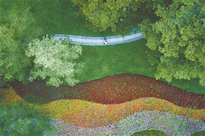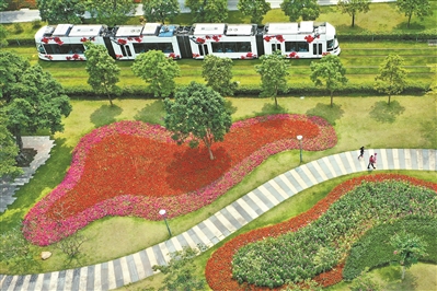 在二沙島綠道上散步的游人途經波浪狀的美麗花景。