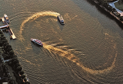 兩艘船在珠江中劃出優美的弧線,宛若“二龍戲珠”。