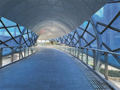 記者在天橋下看到,菱形透明板材包裹著天橋走廊外立面,既為天橋打造了整體化的雨棚,也讓天橋呈現(xiàn)出別具一格的造型景觀。一體化的設(shè)計(jì),富有張力的曲線,廣州市區(qū)塊鏈國(guó)際創(chuàng)新中心人行天橋?yàn)檫@個(gè)承載著不少高科技企業(yè)的街區(qū)增添了一抹天馬行空的未來(lái)感。