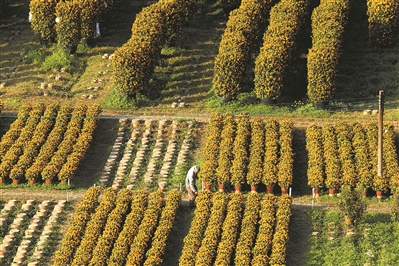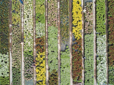 從空中俯瞰,順德陳村花卉世界各類花卉盆景琳瑯滿目。一到周末,就有不少廣州市民專程開車到此采購年花。
