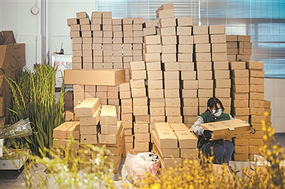 線上賣出的花材精心包裝后,從廣州快遞給全國各地的顧客。