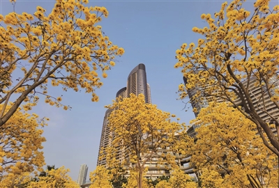 海珠區(qū)環(huán)島路兩旁的黃花風(fēng)鈴木綻放,這段約1公里的路段一片金黃,絢麗奪目。微風(fēng)中,黃花風(fēng)鈴木千姿百態(tài),有市民更是將落花裝入口袋中,帶回家慢慢欣賞。