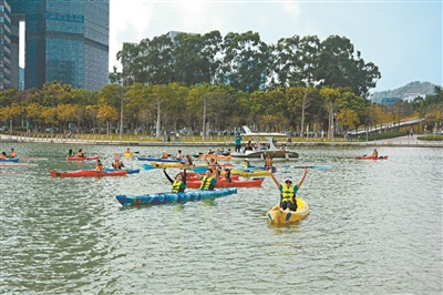 市民在蕉門河上劃皮艇。