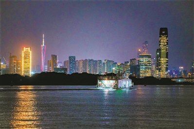 華燈初上,渡船駛離魚珠碼頭。遠處的廣州塔、琶洲互聯網創新集聚區的高樓高聳林立,一幅壯美的城市畫卷展現在眼前。