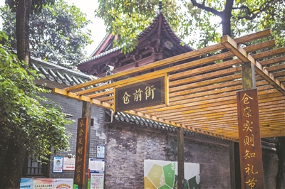 初夏時(shí)節(jié),記者漫步倉前街,街口藤架上爬滿植物,書有“倉前街”三個(gè)字的牌匾懸在藤架中間,兩塊豎匾分列兩旁,上書《管子·牧民》中的名句:“倉廩實(shí)則知禮節(jié),衣食足則知榮辱。”有老街坊告訴記者:“這里已經(jīng)沒有谷倉了,我記事起就只有這條麻石路。”記者看到,腳下路面由四塊麻石并列鋪成,見證了當(dāng)年的運(yùn)糧景象。