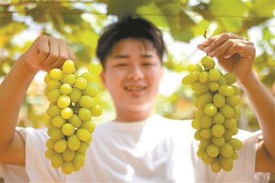 廣東生態工程職業學院葡萄種植基地,劉悅渚手拿著剛摘下的陽光玫瑰葡萄