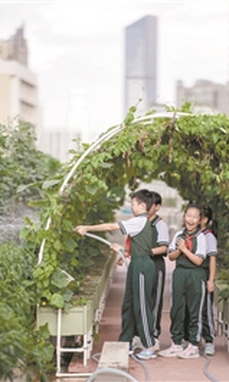 廣州市越秀區回民小學天臺的“城市小菜園”,老師帶著同學們勞作,為菜地除草、施肥、剪枝、澆水